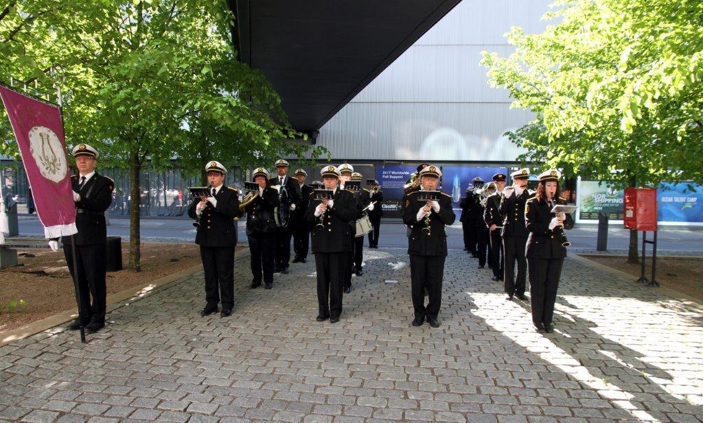 Norges Varemesse var svært tilfreds med Ringerike Janitsjar under åpningen av Nor-Shipping messa tirsdag. Vi er også tilfredse med at hele 25 musikanter klarte å finne tid til å delta en tirsdag formiddag, midt i arbeidstiden. Og det ljomet godt i hallen da vi marsjerte opp langgangen.